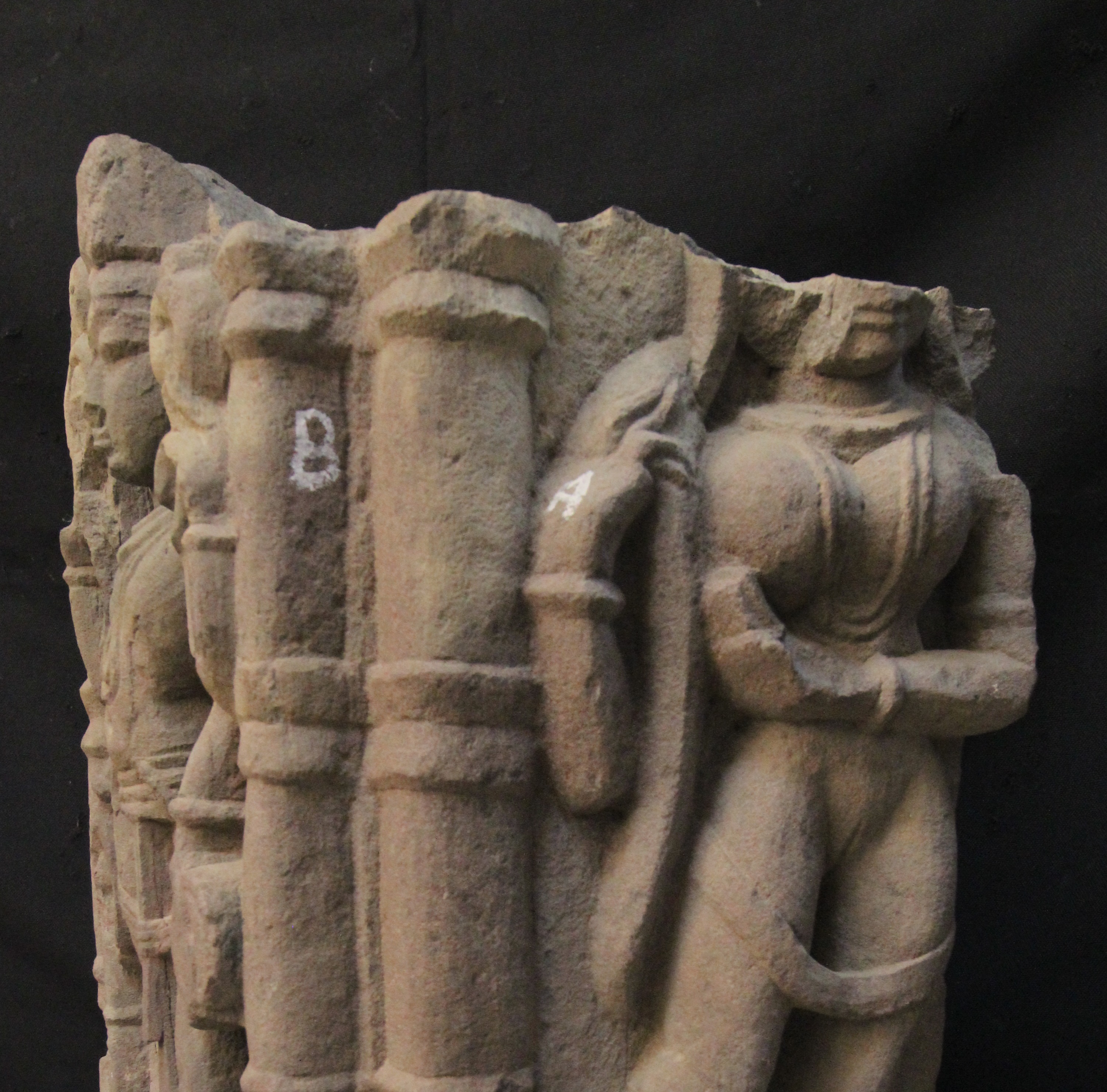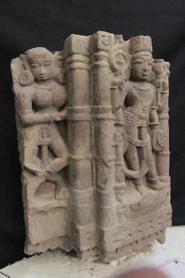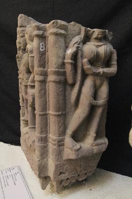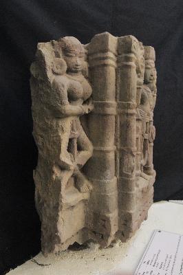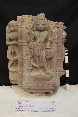 Four-armed standing Vishnu is shown with dwibhanga posture and carries shankh and chakra in his upper and lower left hands, gada and padam in his lower and upper right hands. On his both sides in different part of the panel, two female figures are shown.