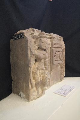 | Description / विवरण | A sculptural panel depicting Apsara adorned with ornaments. This panel is decorated with ghata pallava and patravali. Th right hand of the Apsara is damaged. |