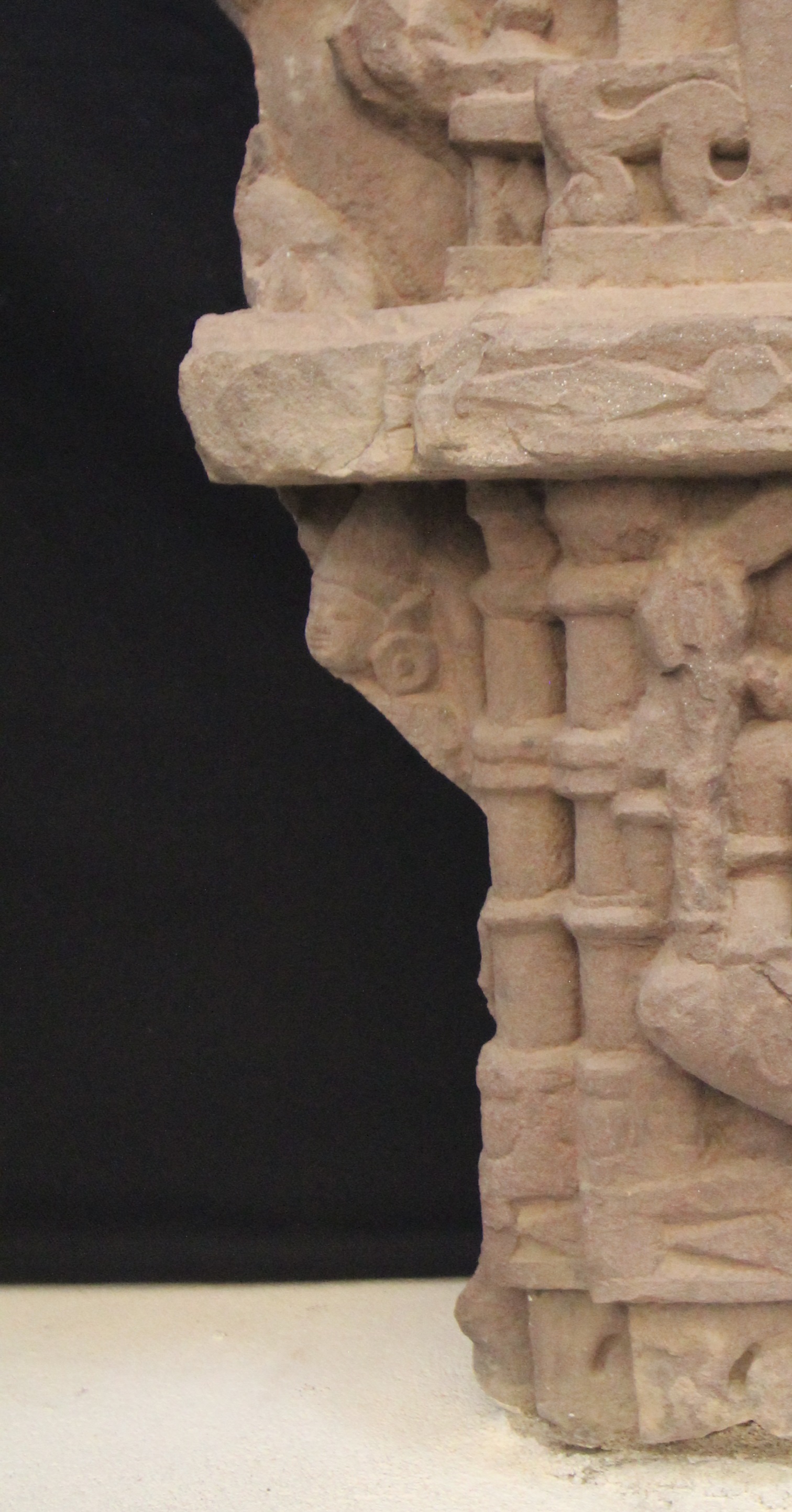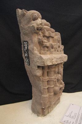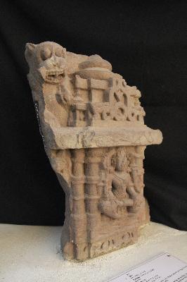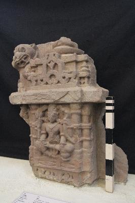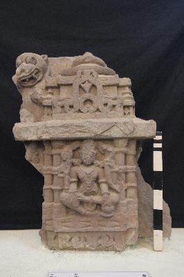 Lord Siva, four armed carrying a trishula and snake in his upper hands while a kamandala is seen in his lower left hand but the attribute in his lower right hand is not clear. On his right shoulder in another part of the panel a face of an attendant is visible. Rest of the body is broken.