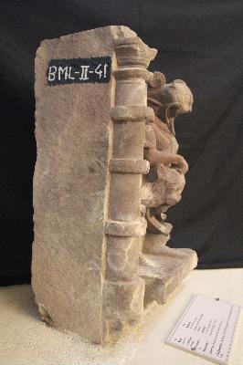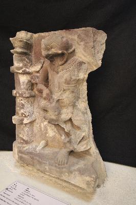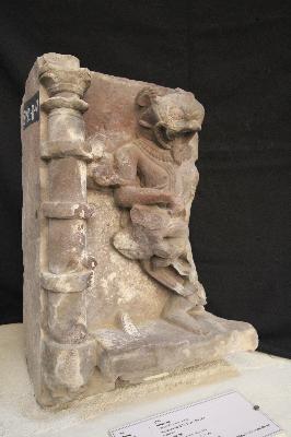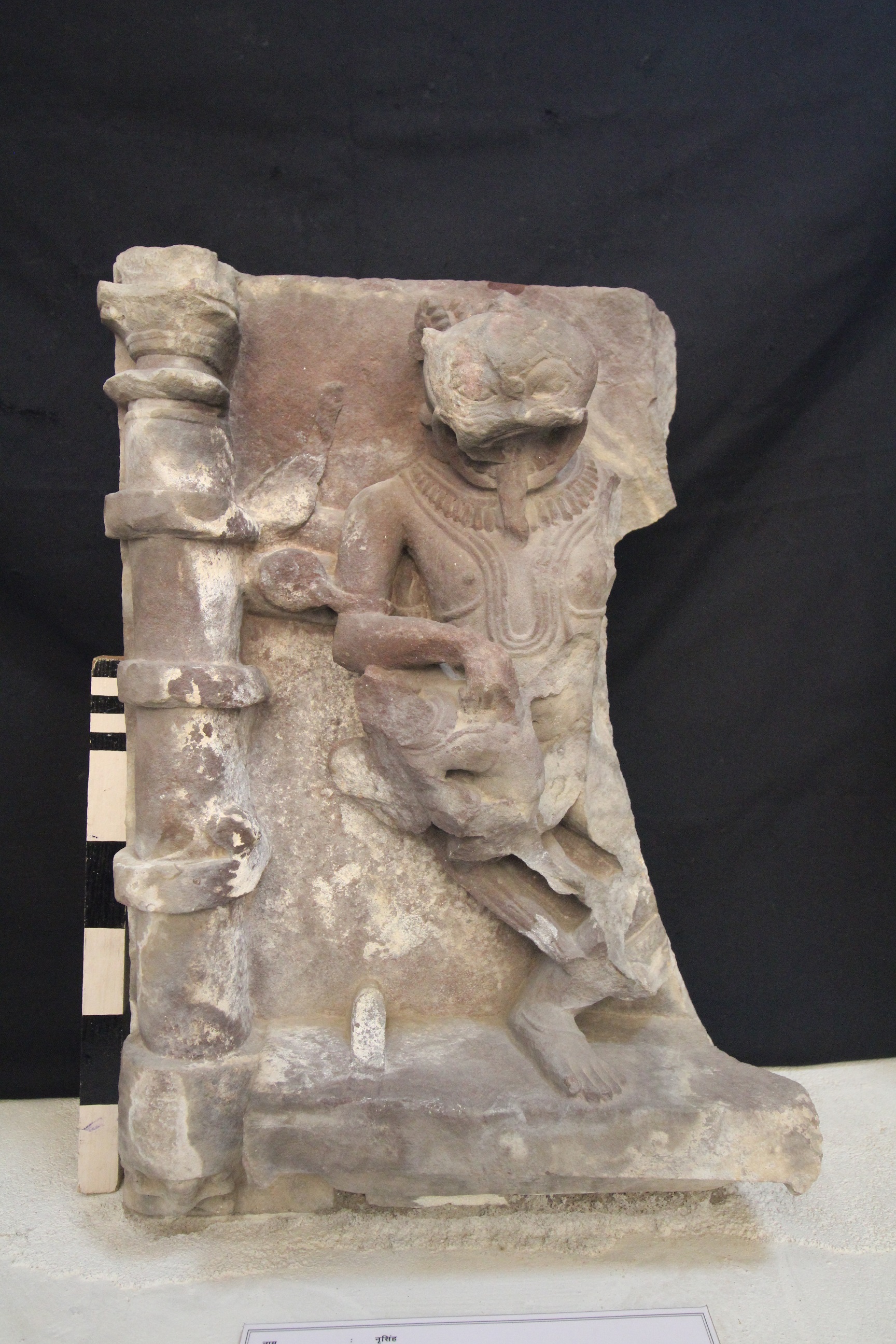 Nrisimha, one of the incarnations of lord Vishnu, is broken from the left side. He is seen with his tongue out, the face shows the emotions of anger and on his lap, a defaced body of Hiranyakashyapu is visible, with half his body broken.
