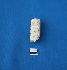 A small white marble pillar depicts a damaged carved female figure.Her hair indicates the cellular structure of the honeycomb design. Hand modelled.