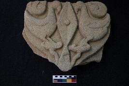 | Description / विवरण | It is either an architectural fragment or a detached part of a mid-relief narrative panel depicting a pair of birds standing on two blooming lotuses. While the birds appear to be fowls in terms of body structure, the feather detailing strongly resembles to that of a duck. However, the short, curved and hook-like beaks of the birds are identical to those of parrots. The pair is standing apart facing one another by the positioning of an elongated rhombus between them. A circular blob is carved at the center of the rhombus. There are two undulating scroll motifs carved at the topmost corners of the fragment. |