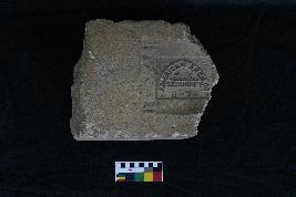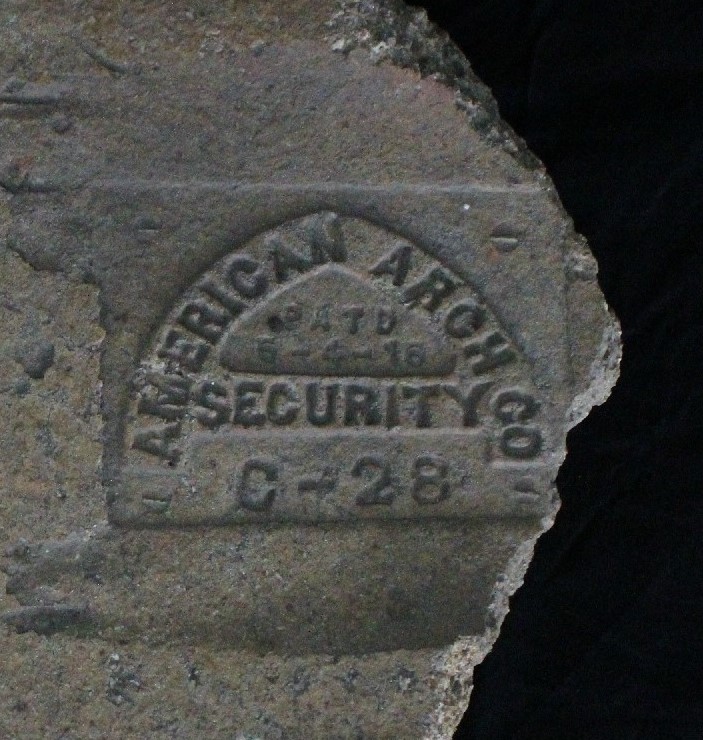 It is a partially broken rectangular-shaped brick. It might have been used as a connecting brick. On its bed surface, it is imprinted with company logo AMERICAN ARCH Co SECURITY . The damaged brick has obvious signs of wear and tear. The brick is heavy in weight, and has a slight patina finish.