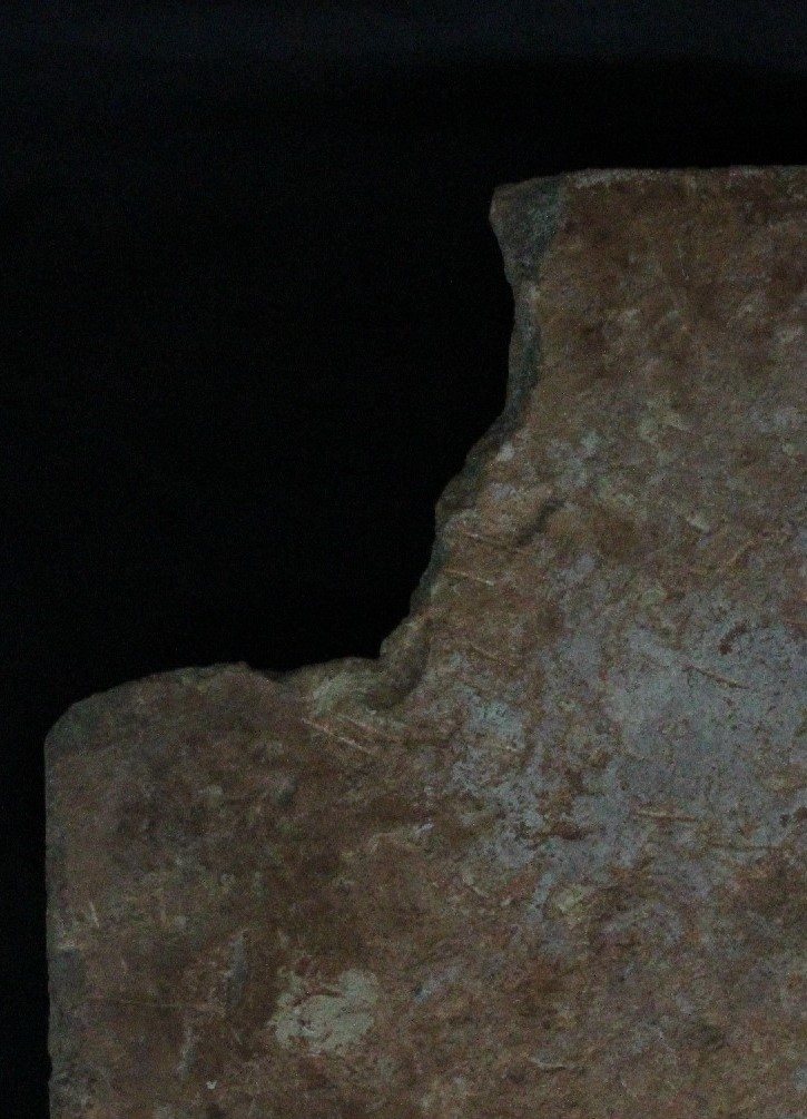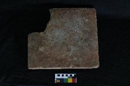 It is a rectangle-shaped brick made out of red clay with a mixture of mica and fine-grained sand. On observation of its smooth texture, the brick must have been used as floor tile. It is well- levigated and a visible greyish hue coloured patch is spread across its bed surface.