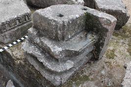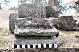 | Description / विवरण | It is a L shaped, broken architectural block consisting of three step-like features carved on two side of the structure, which are layered one after another. The structure has two shallow sokets carved at its top surface. |