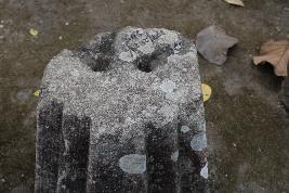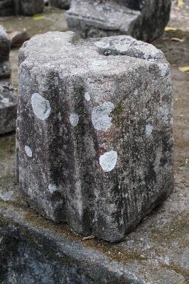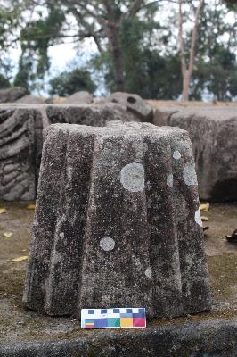 | Description / विवरण | It is a broken piece of architectural member which contains two circular soket along with clamp impression on its top surface. The frontal side of the structure is decorated with two layered step-like feature carved horizontally, the other side of the structure have flat surface with no carvings on it. |