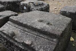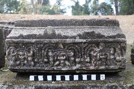 | Description / विवरण | It is a trapezoidal shape architectural piece having two shallow square sokets on its top surface. The fragment is slightly inclined towards the frontal side ended with carving patterns of an arch (the other archs were broken). The frontal side has carvings of three highly eroded kirtimukha motifs over its flat surface carved in a row, which were carved under two horizontal high relief stripe lines. Each motif has carvings of four decorated beaded strings emerging from each side of their heads. |