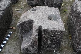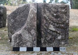 | Description / विवरण | This is a trapezoidal shape broken architectural fragment, it has two square shaped shallow socket on its top surface. The frontal side of the fragment is divided into two parts with a sunken relief shallow vertical stripe. The right side of the fragment is decorated with high relief carving of a semi-arch like feature while its left side is beautifully enhanced with low relief broad floral petals and beaded strings. |