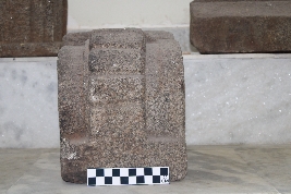 | Description / विवरण | This is a rectangular-shaped decorative block having carvings of circular-shaped shallow sockets on two sides of the block. The frontal side of the block has embellishing carvings of thick rectangular stripes from the top of the structure bending downwards till its base. The high relief patterns carved on the block resemble like that of an amalaka. |