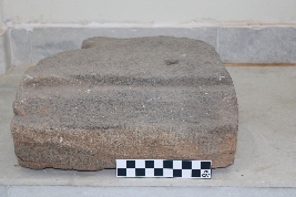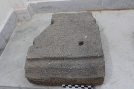 | Description / विवरण | It is a trapezoidal-shaped architectural block having one square shaped shallow socket at its top surface along with clamp impressions at side. The frontal side of the block is enhanced with step-like features carved vertically from its top till bottom. Other sides were unadorned with no carvings on it. |
