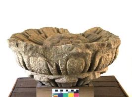| Description / विवरण | This beautifully carved architectural fragment represents a fully bloomed lotus rosette (visva-padma). It depicts a double patelled lotus (mahambuja), enhanced with impressively carved broad petals spreading out of its seedpod with great delicasy and fineness. It is beautified with carvings of petals all over the fragment. |