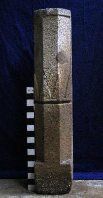 | Description / विवरण | The specimen is a decorative pillar having a square-shaped base and the shaft is a heptagon in the mid part there is a gap. In the upper portion of the gap the floral design is carved all around. The pillar has an irregular heptagon. On the top of the pillar a dowel is present. |
