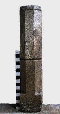 | Description / विवरण | The specimen is a decorative pillar having a square-shaped base and the shaft is a heptagon in the mid part there is a gap segment. In the upper portion of the gap segment, the floral design is carved all around. The pillar has an irregular heptagon. On the top of the pillar has a socket of an iron plugged. |