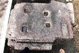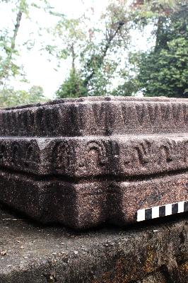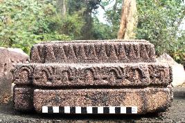 | Description / विवरण | The decorative granite block is part of a ruined architecture. It has a cuboid shape and carvings of three tier telescopic-like features. On the top surface, there are four square-shaped shallow depressions and a metal clamp impression.Two of the edges are carved on a zig-zag pattern. The similar marking is applied to the first-tier as well. The low-relief carvings are made on three sides of the block. The lower section is devoid of any ornamentation. The next row is filled with arch-shaped motifs and within those pointed arrow-like carvings are to be found. The top tier row consists of triangular-shaped pattern. |