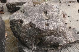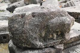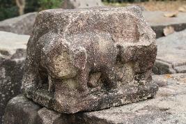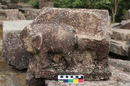 | Description / विवरण | This trapezoidal-shaped architectural block consists of two defaced figures of caparisoned elephants. Both the elephants were carved on two sides of the block, both heading towards each other. Their face was completely broken. Both its ears were prominently carved out. The shape of the body, their thick broad limbs, and tails all represent that of an elephant. Both the elephants were tied up with a rope-like feature. The block has carvings of square-shaped shallow sockets at its top surface. |