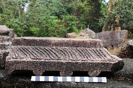 | Description / विवरण | The block is a trapezoidal shaped decorated fragmented part of an architecture. On the top surface, there are two socket-like depressions. There are floral motifs carved on the frontal that extends to the right side as well. There are four hemispherical projectile shapes carvings made underneath the base. |