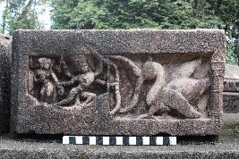 | Description / विवरण | It is a cuboid shaped decorative block carved out of a granite boulder. There are human figurines carved on the frontal and there are several square-shaped shallow depressions and metal clamp impressions carved on top surface. In this panel the artisan attempted to portray a scene from Ramayana where Sita is abducted by Ravana and is confronted by a giant mythical bird named Jatayu. From right to left, a large bird Jatayu shown trying to rescue Sita from the clutches of Ravana. The bird is seen to be flapping its enormous feathers and arduously attacking Ravana with its beak. Ravana, in the middle, represented with four arms and though weathered heavily, is found to be intricately adorned with ornaments. He is clenching the arm of Sita with his right hand. The additional right hand is holding a mace-like object. On his left hand, Ravana is seen using Chandrahasa, the indestructible celestial sword gifted by Shiva according to epic Ramayana, while defending himself against Jatayu s attack. He is holding a bow with his additional left hand. Here, Sita is helplessly standing behind Ravana while the other two are engaged in a fatal duel. |