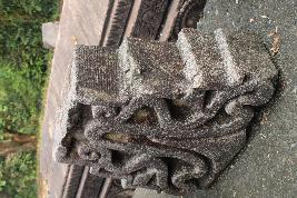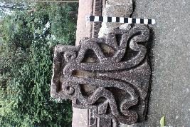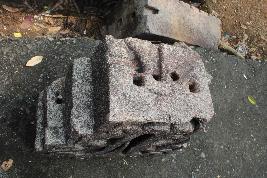 | Description / विवरण | It is a triangular-shaped decorative block carved out of a granite boulder. At the front, there is a high relief motif with carvings of an undulating twisted pattern. The outline of design has an uncanny resemblance to a butterfly. This three-dimensional block has step-like features and has iron clamp and square-shaped impressions at the top. The impressions still retain residues of iron. There is a socket hole on the left side of the fragment. |