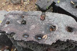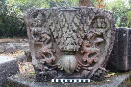| Description / विवरण | It is an upturned conical-shaped architectural block. The designs are carved on the frontal. There are four shallow square-shaped depressions aligned in a horizontal pattern at the top and few oval-shaped shallow depressions There are carvings of sophisticated designs and human figurines made at the frontal. There is an upturned intricately carved half-bloom lotus in a mid-relief reaching the elevated platform of the base. There are two extended lotus buds and two full bloom lotuses carvings which formed platforms on either side for two miniature caparisoned lion and bull. From the looks of it, the upturned lotus appears to be attached to a stylized open mouth which has its tongue sticking out and visible fangs on either side, along with a row of square-shaped teeth. The unfurled coils indicate a fire flare or stylized beard. The V-shape then continue to get narrower around the border and alters to floral petals. There are two figurines, a male and a female, in a low relief. The figure to the left is shown to be mounted on the back of a heavily jewelled bull. The bull has a bell dangling around its neck. A single-string of rectangular beads hanging on its body and anklets (Nupura) carved on all four limbs. The figure mounted on top of it, is of a male and facing its left side. It is standing in a Tribhanga posture with an unidentifiable attribute on his right hand and the left hand folded closer to his chest. It is difficult to identify if there is any ayudha on his hand due to extreme weathering. The facial features are quite prominent. It has an aquiline nose with sharp jawline and beautifully carved eyebrow. The image is adorned with necklace (Kanthabhusana) covering his chest , circular earrings (kundalas), bangles (kankana) on both wrists and an extravagantly ornamented spiked headgear (Sirobhusana). The attribute (ayudha) on the additional left hand is distinguishable and is called Sula (battle axe) which is predominantly associated with Shiva . The long handle is made of wood that has a tri-pronged pike at top end. The image here could be of Shiva. He is wearing a long garland of severed human heads. The other figurine is of a female deity. She is shown mounted on top a lion standing in a tribhanga posture. The female has four hands and each of them is holding an attribute (ayudha).From left to right, the deity is shown holding an unidentifiable attribute with the additional left hand, the other arm is broken completely. She is shown carrying a beaded bracelet with her right hand which is folded closer to her chest. In the additional arm, she is shown holding a small drum (Damaru).She has an aquiline nose with distinct jawline and long eyebrows. She is adorned with circular earrings (Kundalas), heavily ornamented necklace (Kanthabhushana) covering her entire chest area, an embellished spiked headgear (Sirobhushana), bangles (Kankana) covering both the lower arms and, Nupura and Padajalaka on both the ankles. A sophisticated girdle around the waist can be noticed along with a long garland. A stylized garment with wavy design is shown to be worn by the figure covering the thigh area and a strand of fabric dangling in between the legs. The animal, lion, is an unconventional one. It has a short mane and is shown wearing a beaded necklace with a dangling bell. Its head is twisted back with his tongue sticking out. Both the figures are facing each other as if preparing for a duel. |