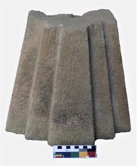 | Description / विवरण | This specimen is a capital of a pillar having two iron plugged sockets on top of it. The design is carved like a L-shaped stair, from both the right and left sides that could be seen as meeting it on one platform. |