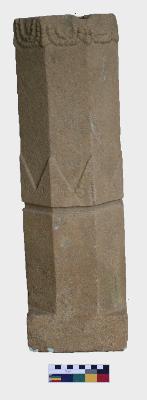 | Description / विवरण | This specimen is a decorative pillar having two designs on it. The upper portion is decorated with a beaded pattern and on the shaft part there is a segment carved as a division, along there is a triangular shape having undulated spiral designs carved. This pillar is octagonal in shape and top of the pillar there is an iron plugged socket is present. The top portion of the pillar is slightly broken and the pedestal part is having a square shape. |