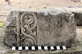 | Description / विवरण | It is a square shaped architectural fragment with a number of five soket on top of it which has a carving of very highly decorative geometric and floral patterns with visible creepers and leaves along with a carving of bass relief river swan. The heavily bodied swan is decorated with carvings of circular patterns on its body, its long neck, beak and eyes were very prominent. |