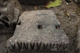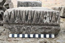 | Description / विवरण | A square shaped stone block with three soket on its top has carvings of a number of nine sharp pointed triangles from top to middle part of the fragment in a row. It also has a sunken relief plain strip line carved out of the stone block. |