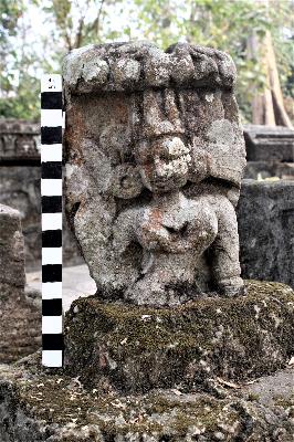 | Description / विवरण | It is a representation of the upper body of a female figure carved under a lotus canopy, the parts below its waist is missing. The figure is crowned with a pointed headgear with its hair dressed in a bun. The facial representations of the figure include a circular face with closed eyes, a sharp pointed nose and lips, adorned with huge circular decorated kundalas along with karna puspa, a highly eroded necklace around its neck, an ornamented necklace over its bust, an armlet on its left upper arm, a bracelet below the armlet and pair of bangles. The right arm of the figure is mutilated. |