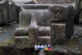 | Description / विवरण | This is an architectural fragment of a temple. Sockets of iron clamps are present on the top. The right side of the frontal part is carved outward where an upward-pointed carving is present at the lower part. Whereas there is a pearl shape design is present on the upper part of the left side. |