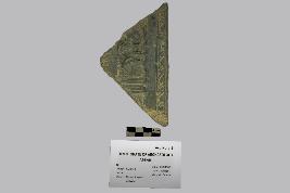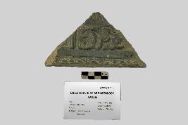 | Description / विवरण | It is a triangular fragment of an architectural member with floral decorative scrolls on either side and the motif of a gajavyala (a lion sitting atop an elephant) in the middle. The gajavyala, which represents a lion defeating an elephant is a very typical motif of Hindu iconography. |