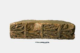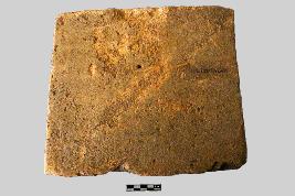 | Description / विवरण | It is a rectangular terracotta brick with decorated uneven surface and partially chipped off edges. The stretcher surface (wider face) of the brick is decorated with four sets of vegetal patterns. It was originally made of coarse-grained red clay. Signs of weathering are prominent from the flaking and scratches. The cross-section of the brick confirms its gritty texture. |