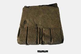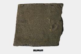 | Description / विवरण | It is an asymmetric fragment of a rectangular terracotta brick with plain uneven surface and partially chipped off edges. Two sets of telescopic slabs are curved in the slightly rounded stretcher surface of the brick. It was originally made of coarse-grained red clay. Signs of weathering are prominent from the flaking and scratches. The cross-section of the brick confirms its gritty texture. |