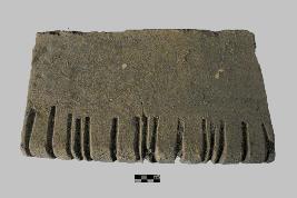 | Description / विवरण | It is a decorated terracotta brick of trapezium shape with one rounded edge. On the rounded stretcher side (wider side) and bed (top surface) of the brick, there are horizontal trident designs. The rest of the surfaces is plain. It was originally made of fairly good-grained red clay. Signs of weathering are prominent from the flaking, scratches and chipped off edges. |