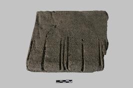 | Description / विवरण | It is an asymmetric fragment of a rectangular terracotta brick with plain uneven surface and partially chipped off edges. The stretcher surface is decorated with two trident designs. It was originally made of coarse-grained red clay. Signs of weathering are prominent from the flaking and scratches. The cross-section of the brick confirms its gritty texture. |