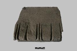 | Description / विवरण | It is an asymmetric fragment of a rectangular terracotta brick with two trident patterns in the slightly rounded stretcher surface of the brick. It was originally made of coarse-grained red clay. Signs of weathering are prominent from the flaking, scratches and chipped off edges. The cross-section of the brick confirms its gritty texture and ill-fired state. |