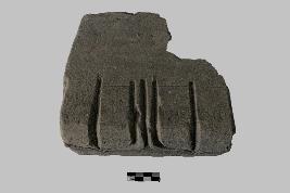 | Description / विवरण | It is an asymmetric fragment of a rectangular terracotta brick with two trident patterns in the slightly rounded stretcher surface of the brick. It was originally made of coarse-grained red clay. Signs of weathering are prominent from the flaking, scratches and chipped off edges. The cross-section of the brick confirms its gritty texture and ill-fired state. one of the arrises of the brick is broken. |