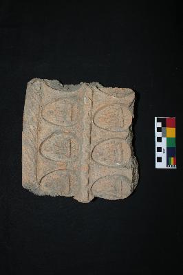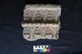 | Description / विवरण | It is an asymmetric fragment of a rectangular terracotta panel of the Buddha. Only two rows of the panel have survived with three Buddhas in each. The Buddha is depicted in Bhumisparsamudra and plain halo over his head with two votive stupas in each side of him. A cross-section analysis of the brick confirms its granular and porous texture and ill-fired nature. |