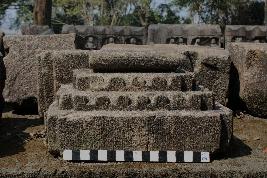 | Description / विवरण | It is an architectural fragment where iron clamps are present at the top of the fragment. The architectural fragment is a stepped pyramidal in shape. Four steps can be seen in the fragment. The edges of the middle two steps consist of protruding edges. The lower portion is absent any kind of carvings. |