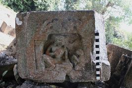 | Description / विवरण | This is part of a temple. There is a frame having two columns and a floral lintel carved on the frontal surface where an unknown figure is placed in lalitasana. There is an uttariya adorned on the left side of the head. The right hand is placed over the chest whereas the left hand is on the knee of the left leg. There is another unknown attendant carved on the left side of the main figure which is small in size as compared to the main figure. The figure is in namaskara mudra and the left leg is lying on the floor and the right leg is bending. Due to the erosion, the figure is not recognizable. |