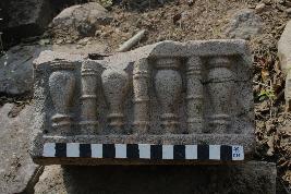 | Description / विवरण | This is an architectural fragment of a temple. At the frontal part, there is a row of columns. Two types of columns can be seen where one type has two circular rings present at the top and the middle part is carved as an inverted Kalash and the base is composed of circular rings. On the other hand, one type of column is vertical and segmented by rings over the body. |