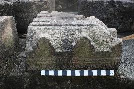 | Description / विवरण | This is an architectural fragment of a temple. At the top, there are sockets of iron clamps present. On the upper part frontal surface, there are two protruding edges carved out. Hanging pearl shape decoration can be seen at the lower part. |