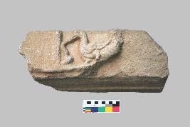 | Description / विवरण | This is a carving of a goose-like bird on a rectangular platform where the bird is facing towards the right side and is held by a snake-like creature between its beaks. The body is covered with feathers on the entire body whereas the wings are prominently carved. Two legs are also visible but partially broken. |