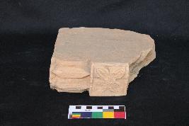 | Description / विवरण | It is a broken terracotta brick with plain uneven surface and partially chipped off edges. One the stretcher surface has geometric and floral decorations where a flower with four petals is curved inside a square box, along with a set of triangular polyhedrons. The circle inside the flower has crisscross designs on it. It was originally made of coarse-grained red clay. Signs of weathering are prominent from the flaking and scratches. The brick has a granular texture. |
