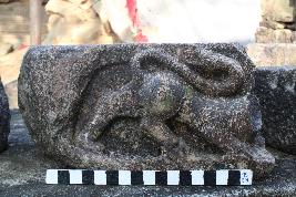 | Description / विवरण | This is an architectural fragment of a temple. There are sockets of iron clamps are present on the top. There is a figure of a lion carved out on the frontal side. The tail of the lion is in the upward position. Hind legs are spread out whereas the chest of the lion is leaning on the pedestal. From the neck other portion of the lion is missing. |