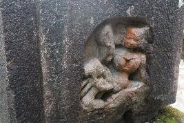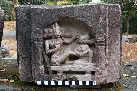 | Description / विवरण | It is an architectural fragment of cuboid shape carved out of a granite boulder. There are rectangular-shaped socket holes and clamp impressions of the top surface.The fragment holds images in action on its three faces. The edges on the frontal of the fragment are carved in a zig-zag pattern. Alongside the images, one could observe the outlines around the pillar-like carvings which the artisan(s) must have prepared prior to chiseling for their convenience. The images are carved within a shallow arch-shaped niche in a mid-relief. There are pillar-like carvings on either side. The figurines are of a female and a male found to be sitting on a slightly elevated platform. One could see a rectangular-shaped slab behind the male on which he is found to be resting his back. The female is seen to be massaging one of the male s feet. Here, the carvings of the male are distinct. He is seated on the left side of the frame on top of a cushion-like object. His right leg is extended straight and being massaged by the female whereas the left one is found to be folded and almost closer to the chest. His right hand is seen to be holding an unknown rectangular ayudha (attribute) and the left hand is suspended in the air as if playing with the female s hair. The facial features are prominent.The image has a sharp jawline, beard imperial mustache, dramatic eyebrows and snub nose. His hair is tied into chignon bun which is visible behind the the embellished spiked headgear that he is found to be wearing. The lower half of the hair is seen to be waving in the air.Though bare-chested, the image is adorned with heavily ornamented Kanthabhusana (necklace).There are three bangles (kankana) woren on his left wrist and the right wrist has a floral-shaped bracelet, there is a beaded haath-phool (hand chain jewellery) carved on the left palm. There are intricately designed armlets on both the upper arms and wearing elongated earloops. There is a girdle around the waist and the knot is visible on the exposed side. There is a fabric draped around his lower waist that covers his thighs. It has spiral designs on it. The female, on the other hand, is shown in a simple attire. She has a round shaped face, broad nose, and a dimly smile on her face. Her hair is tied into a chignon bun but some loose hair is seen waving in the air. She is seen sitting in a straddled posture with left leg bent knee upright and the right leg folded lying at ease. Both of her hands are shown to be massaging the male s ankle part. She adorned with design-less circular kundalas (earrings), hara and long necklace which covered are voluptuous breasts. There are nupura on both the ankles, bracelets covering both the lower arms.The Antariya is visible in between her thighs. On the right face, there are three socket-like holes are on the top edge and an unknown image carved inside a shallow niche. The image is indecipherable due to extreme weathering. The image carved on the left hand is within an uneven shaped niche. It consists of a female figurine who is shown in a seated posture.Except for the broad nose and a wide smile, the other facial features are heavily eroded hence, makes it difficult to understand the characteristics. she is seen to be wearing a hara. There is a open-socket hole on the base part possibly used to fix it on a surface. |