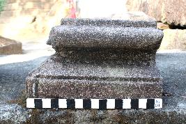 | Description / विवरण | This is an architectural fragment of a temple. There are sockets of iron clamps present on the top. The fragment is composed of two parts. The upper part is square in shape and the edges are elaborately polished while the middle portion is carved inward. The edges of the lower parts are devoid of any decoration but the corners are stylistically carved. |
