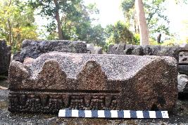 | Description / विवरण | This is an architectural fragment of the temple. There are three protruding edges carved on the upper part of the frontal surface. There is a row of downward arrows along with the inverted arch of pearl shape design on the frontal side. This is probably an adhisthana moulding of a temple. |
