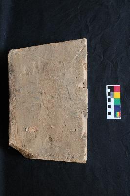 | Description / विवरण | It is a decorated terracotta brick of trapezium shape with one rounded edge. On the rounded stretcher side (wider side) of the brick, there are three horizontal trident designs. The rest of the surfaces are plain. It was originally made of medium-grained red clay. Signs of weathering are prominent from the flaking, scratches and chipped off edges. |