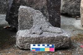 | Description / विवरण | This is a fragment of an unknown figure. Bellow the portion from the knee is present on a pedestal. There is a foot on the pedestal where fingers are clearly visible. Near the feet, there is a feet-like feature present but due to the erosion, it is not clearly identifiable. The figure might have been in a posture before the mutilation on the other hand there is a stele present behind the figure. |