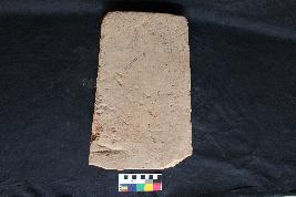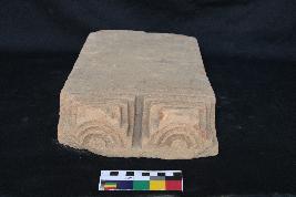 | Description / विवरण | It is a rectangular terracotta brick with decorated surface and partially chipped off edges. The decorative stretcher side (wider surface) of the brick has two sets of telescopic slab-like projections with rainbow-like arch patterns therein. It was originally made of coarse-grained red clay. Signs of weathering are prominent from the flaking and scratches. |